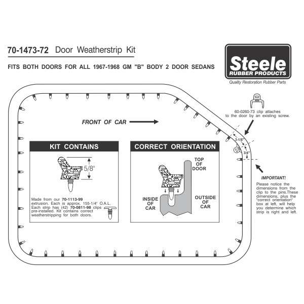 This Front Door Weatherstrip pair is designed from the original parts for superior fitment and seal. These primary front door weatherstrips seal the driver (LH) and passenger (RH) doors when closed.
