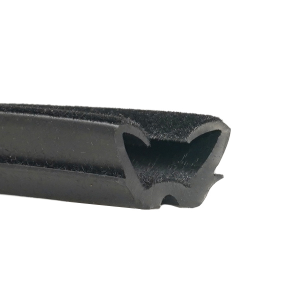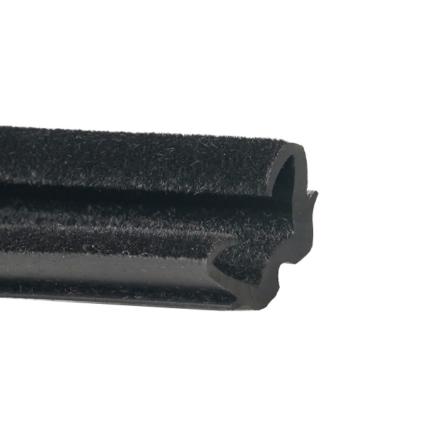 U-shaped weatherstripping channel. Made with an electrostatic flocked rubber that has flexibility and reduces friction to secure and let glass or other material slide inside the channel.